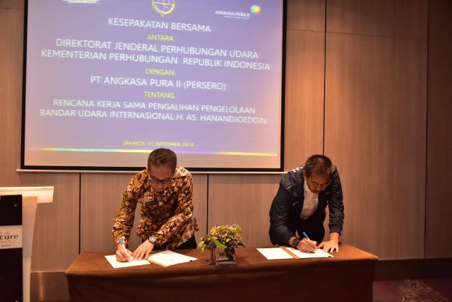 TRAVELOUNGE.CO I JAKARTA – Direktorat Jenderal Perhubungan Udara Kementerian Perhubungan dan PT. Angkasa Pura 2 (Persero) Jumat (21/09) melakukan penandatanganan kesepakatan bersama tentang rencana kerja sama pengalihan pengelolaan Bandar Udara H. AS. Hanandjoeddin- Bangka Belitung.