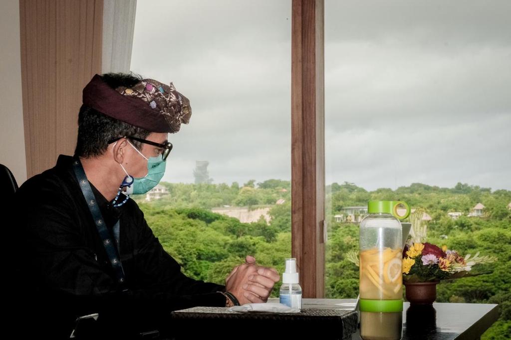 Menparekraf Sandiaga Uno usai Rapat Pimpinan dengan para pejabat eselon I dan II di lingkungan Kemenparekraf secara hybrid di Politeknik Pariwisata Bali, (28/1/2020), mengajak pengusaha dan para profesional untuk bisa bekerja sambil berwisata di Bali.