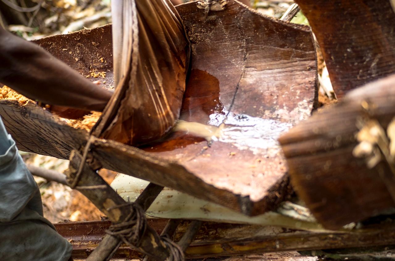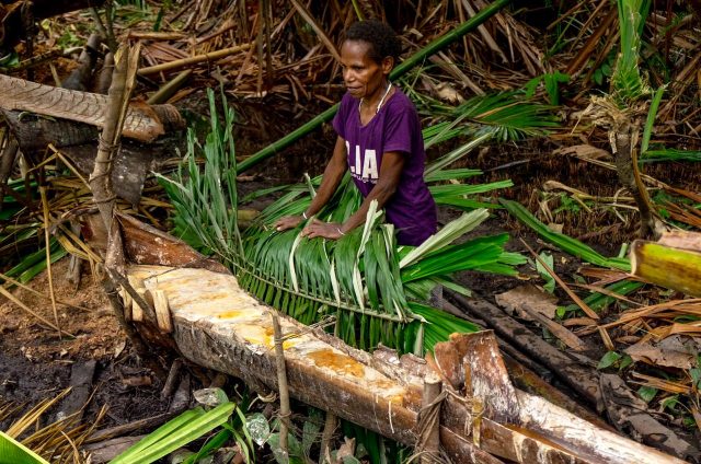 Lepas itu akan ada seorang warga yang memeras bubuk bakal sagu tersebut di atas papan. Airnya mengalir melewati pipa kayu, lalu ditampung dalam wadah dan didiamkan beberapa hari. Nantinya, air tersebut akan memgering dan menjadi sagu.