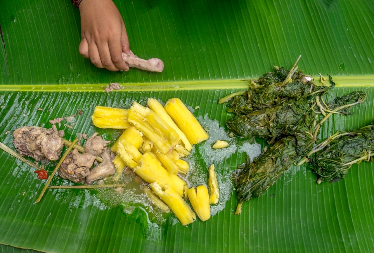 Untuk sagu yang sudah matang, sajian berupa bubuk sagu yang dimasukkan ke bilah-bilah bambu. Sagu itu dibalut dalam sayuran yang disebut sayur gedi yang rasanya seperti daun pepaya. Gedi dimasak dengan sagu tanpa bumbu apapun. Rasanya tawar, tapi tetap terasa segar. Umumnya gedi dan sagu disantap bersama singkong atau kasbi dan ayam hutan yang direbus dalam bilah kayu.