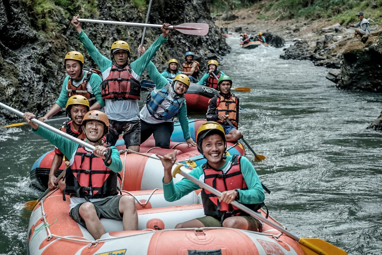 Sungai sepanjang 12 kilometer itu dihiasi pepohonan yang masih asri dan rimbun. Menjadi selimut di sepanjang perjalanan karena memang kehijauan itu terhampar dari garis awal hingga akhir. Meskipun saat itu debit air tidak terlalu tinggi, wisatawan bisa menikmati arung jeram sambil mematuhi standar keamanan yang diinformasikan oleh instruktur.