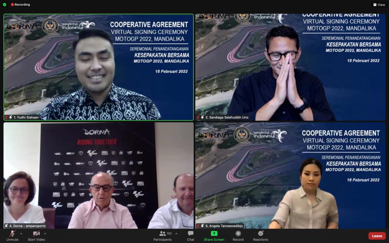 Penandatangan Kesepakatan Bersama ini dilakukan secara daring oleh Deputi Bidang Produk Wisata Dan Penyelenggara Kegiatan (Events) Kemenparekraf/Baparekraf, Rizky Handayani dengan CEO of Dorna Sports, Carmelo Ezpelata, serta disaksikan oleh Menteri Pariwisata dan Ekonomi Kreatif/Kepala Badan Pariwisata dan Ekonomi Kreatif, Sandiaga Salahuddin Uno; Wakil Menteri Pariwisata dan Ekonomi Kreatif/Wakil Kepala Badan Pariwisata dan Ekonomi Kreatif, Angela Tanoesoedibjo; dan seluruh jajaran di lingkungan Kemenparekraf/Baparekraf. Kesepakatan bersama ini meliputi penyelenggaraan event MotoGP 2022 di Mandalika.