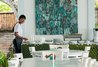 Coba tengok interior bagian indoor Laut Biru yang serba putih. Mulai dari dinding, meja kursi sampai hiasan hiasan di dinding juga putih. Semuanya jadi terlihat cantik. Sedangkan bagian outdoor nya disediaan beberapa meja kursi di bawah rimbunnya pepohonan, jadi tetep teduh, gak kepanasan meski di luar ruangan. Santai sambil asyik menikmati panorama pantai yang berpasir putih.