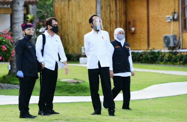 Presiden melihat langsung persiapan penerapan normal baru di sejumlah tempat di Banyuwangi. Dengan mengenakan pelindung wajah dan menerapkan jaga jarak, Presiden dan rombongan meninjau Resort/Villa Pantai So Long dan Hotel Dialoog. Di tempat tersebut Presiden juga mendengarkan paparan dari Bupati Banyuwangi Abdullah Azwar Anas mengenai persiapan prakondisi di sektor pariwisata.
