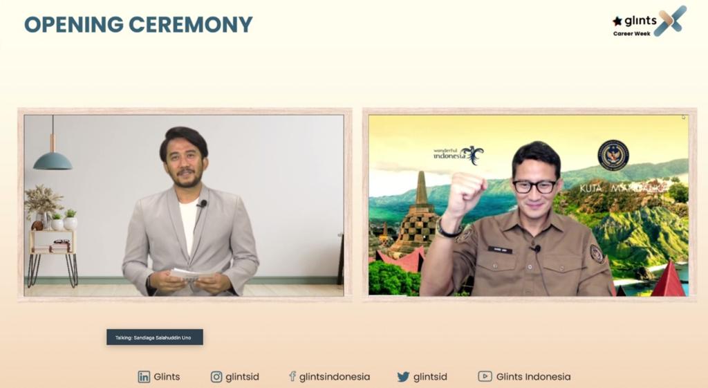 Dalam pembukaan “Glints X Virtual Career Week”, Rabu (21/7/2021), Sandiaga mengatakan masa pandemi COVID-19 memaksa para pelaku pariwisata dan ekonomi kreatif untuk terus berinovasi, berkolaborasi, dan beradaptasi dalam berkarya. “COVID-19 ini memaksa kita untuk meningkatkan keterampilan kita karena 60 persen lapangan kerja yang akan kita temui di masa pandemi dan pascapandemi ini adalah lapangan kerja yang tidak ada sebelumnya,” kata Sandiaga.