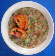 Saat disajikan, dari tampilan warna dan aromanya, Soto Santan Jembatan Goyang sudah terasa nikmat dan kelejatannya. Aroma bumbu tradisional kental terasa. Menyerap diantara kuah soto dan potongan daging yang mengobok obok selera. Apalagi potongan daging sapinya begitu empuk di kunyah. Ada dua pilihan yang ditawarkan, Soto Santan Daging atau campur ( paru, saging, sengkel, hati, babat).