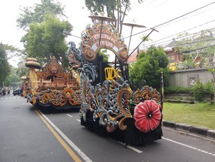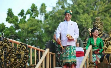 Saat melepas pawai, Presiden Jokowi menaiki mobil hias mengikuti rute pawai. Melalui mobil hias berdesain khas puri Bali, Presiden Jokowi membagikan makanan khas Bali kepada para pengunjung yang antusias.