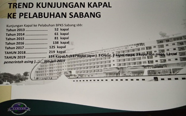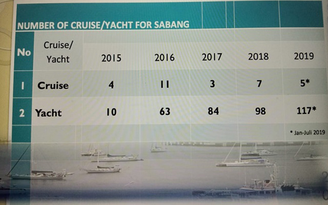 Arus kunjungan Kapal Cruise dan Yacht pun terus meningkat. Kunjungan Cruise pada 2015 sebanyak 4 kapal, 2016 sebanyak 11 kapal, 2017 sebanyak 3 kapal 2018 sebanyak 7 kapal, dan 2019 diprediksi mencapai 10 kapal. Sedangkan untuk Kapal Yacht pada 2015 sebanyak 10 Kapal, 2016 sebanyak 63 Kapal, 2017 sebanyak 84 Kapal, 2018 sebanyak 98 kapal dan 2019 diprediksi mencapai 117 Kapal. Total kunjungan Kapal ke Sabang pada 2019 akan mencapai 134 kapal.