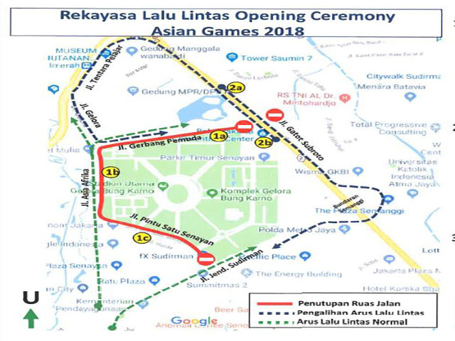 2. Opening Ceremony Asian Games2018 dilaksanakan pada hari Sabtu tanggal 18 AgustusĀ 2018 diStadion Utama Gelora Bung Karno Senayan mulaipukul 14.00 s.d selesai. AdapunĀ rekayasa lalu lintas pada saat acara tersebut adalah sebagai berikut: