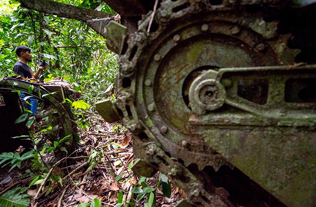 Yah, di antara hutan rimbun tersebutlah ditemukan beberapa tank yang teronggok berbalut rerumputan akar dan tumbuhan liar. Tank yang ditemukan tersebut diperkirakan berjenis amfibi dan artileri. Meski tampilannya sudah banyak karat, namun masih utuh. Roda dan rantai yang melekat pada tank pun tak terlepas dari tempatnya. Beberapa bagian sengaja dirusak agar tank tidak bisa digunakan lagi.